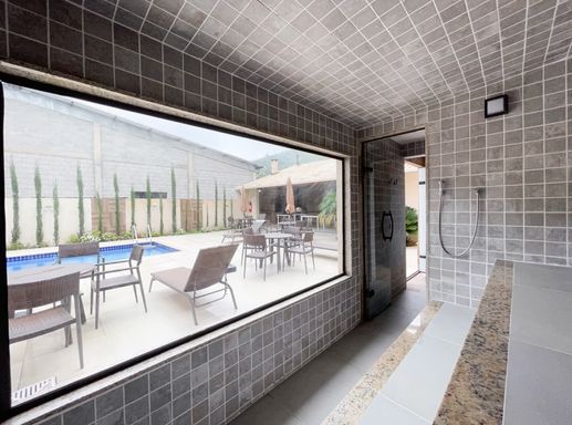 • Espaço gourmet com churrasqueira e forno de pizza, ideal para confraternizações