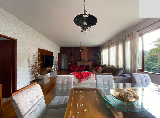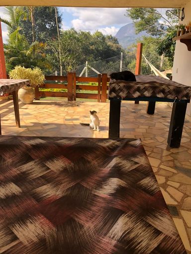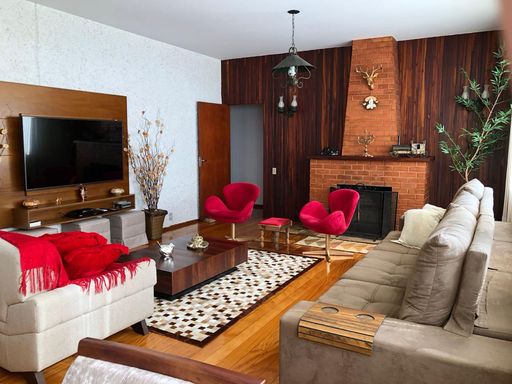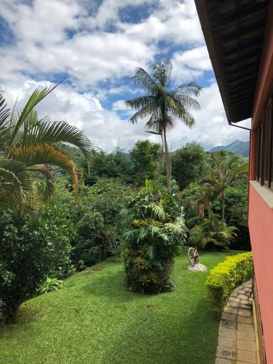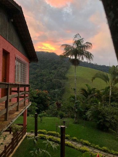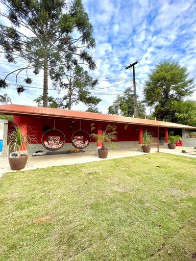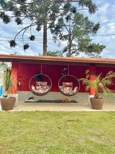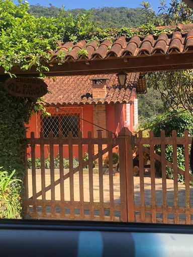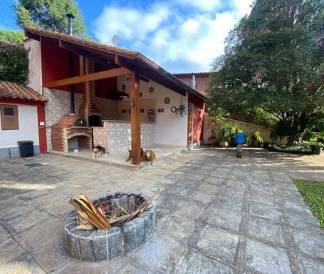 A casa principal conta com três quartos, sendo uma suíte com varanda, sala aconchegante com lareira e varandão, perfeita para aproveitar o clima da serra. A cozinha é espaçosa, integrada à copa com fogão a lenha, trazendo aquele charme especial de casa de campo. Possui ainda área de serviço e banheiro social.
