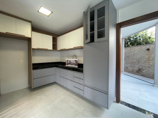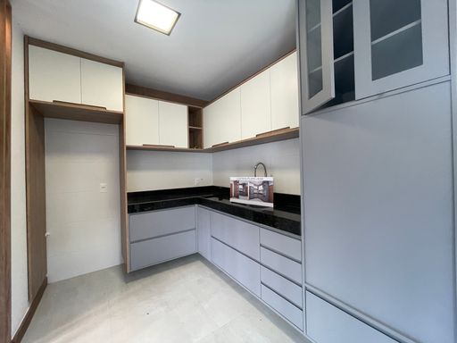 • Cozinha com divisória e armários planejados de bom gosto e qualidade